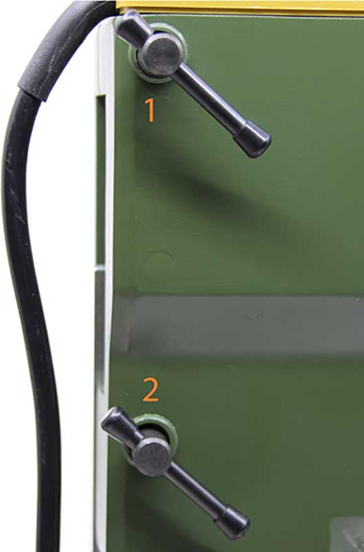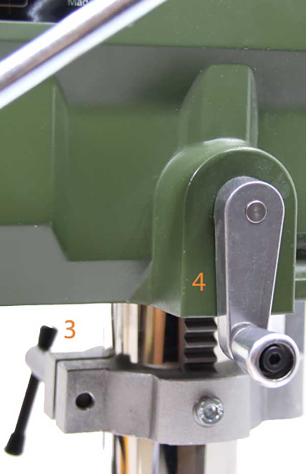 Seitlich an der Maschine befinden sich die Klemmhebel zur Höhenverstellung zur Grobverstellung müssen die Hebel 1 ,2 und 3 gelöst werden. Zur Feineinstellung müssen die Hebel 1 und 2 offen, und Hebel 3 angezogen sein. Nun kann mit der Kurbel 4 die Feineinstellung vorgenommen werden. Zur Sicherung müssen jedoch die Hebel 1 und 2 wieder angezogen werden