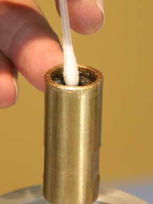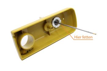 Führen Sie jetzt den Wasserstab durch den Deckel. Der Wasserstab (siehe Bild ) wird nur im oberen Drittel gefettet. Das Fett können Sie hier mit Daumen und Zeigefinger verteilen. Setzen Sie nun den Deckel incl. Wasserstab wieder auf die Maschine. Ziehen Sie die zwei Befestigungsschrauben handfest an.