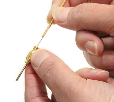 Unsere Bohrer werden immer mit einer Auswerfernadel geliefert. Während des Bohrvorgangs schiebt sich diese Auswerfernadel zurück und beim herausfahren aus der Bohrung wird dieser durch den Anschlag am Wasserstab wieder nach unten gedrückt und stößt somit den Bohrstöpsel aus. Die Diamanthohlbohrer sind in einer Aufnahme eingelötet. Diese Aufnahme wird als Typ „F“ bezeichnet und hat am hinteren Ende ein Gewinde 4x0,5 mm. Der Auswerfer wird von hinten in die Aufnahme eingeführt und soll noch ca. 1mm über den Bohrerrand herausragen. Der Bohrer wird zusammen mit der Auswerfernadel in die Maschine eingeschraubt und mit einer Zange Handfest bzw. leicht angezogen. (Bilder ähnlich)